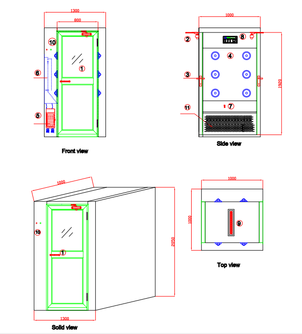 1. IC智能线路板控制,电子互锁,光电感应自动吹淋。The control system by IC intelligent control panel, blowing automatically by photoelectric sensor, the two doors are electric interlocked.